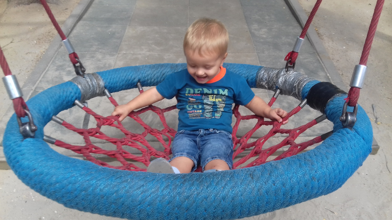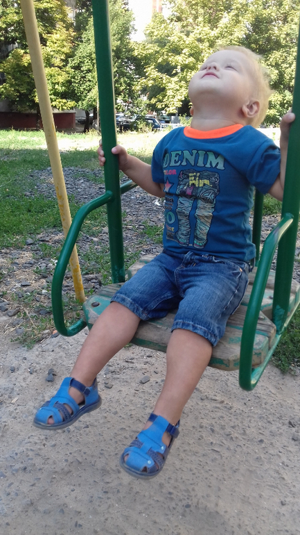 Такой же неугомонный, висит на турниках, нравятся самые большие и высокие горки, забирается и катается сам, я давно уже не страхую. Обязательно надо залезть на все заборы по пути, парапеты, подняться по всем лестницам. Дома так же, лезет на самый верх всех шкафов)) Я Илюшу выряжаю на каждую прогулку, но домой мы приходим грязные, только купаться надо)