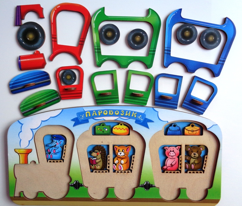 Потом две соседних, потом три. Потом верх или низ. Так приходим к целому пазлу. Надо чередовать два или три подобных пазла. У нас были сразу на 20 и 30 деталей. Сюжет такой чтобы ребенку нравилось - у нас поезд и самолет