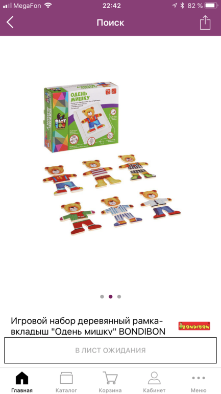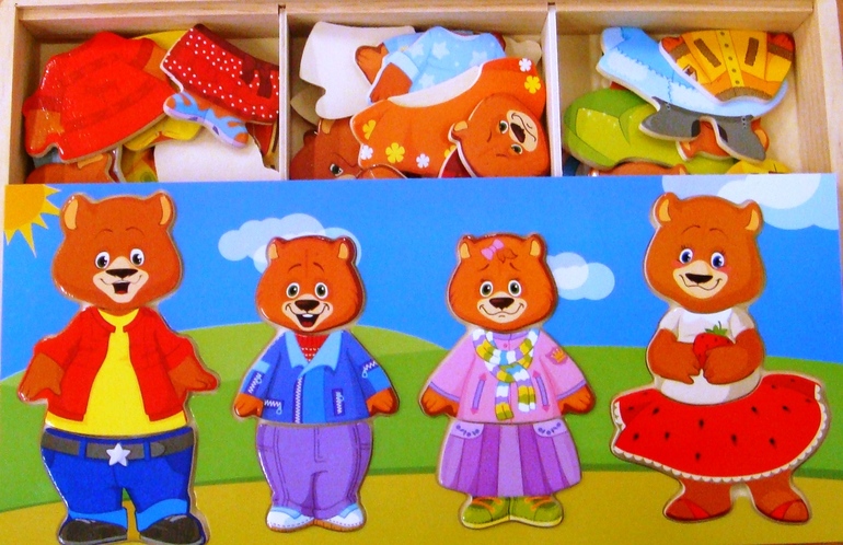 Моей нравится медведей переодевать. Деревянные пазлы такие. Подбирает настроение по лицу, штаны/юбочки, и рубашечки. Ну и соответственно учится размерам -больше/меньше. И нравится, Как я понимаю, ей именно выбирать одежду и морды мишек. Минут 20 может играть.