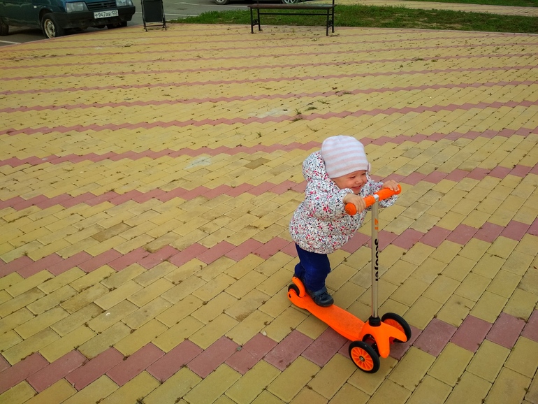 А что, она уже соображает пользоваться самокатом? Мой такой же по возрасту, тянет к самокатам, а я все думаю маленький ещё.