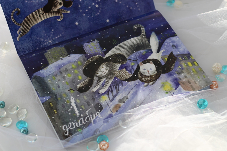 Это "Календарь ожидания Нового года" от издательства "Речь" (тык ссылка). Я наткнулась на него совершенно случайно, но не смогла не приобрести. Формат А4, плотная мелованная бумага, отличная печать. Он сделан в форме настоящего отрывного календаря. Каждый лист снабжен пунктирной линией перфорации и легко отрывается от основы. Всего 31 лист по числу дней в декабре. Каждая дата сопровождается прекрасными иллюстрациями художника Ольги Фадеевой, той самой, которая подарила миру детской литературы "Котофеев" и других персонажей.
