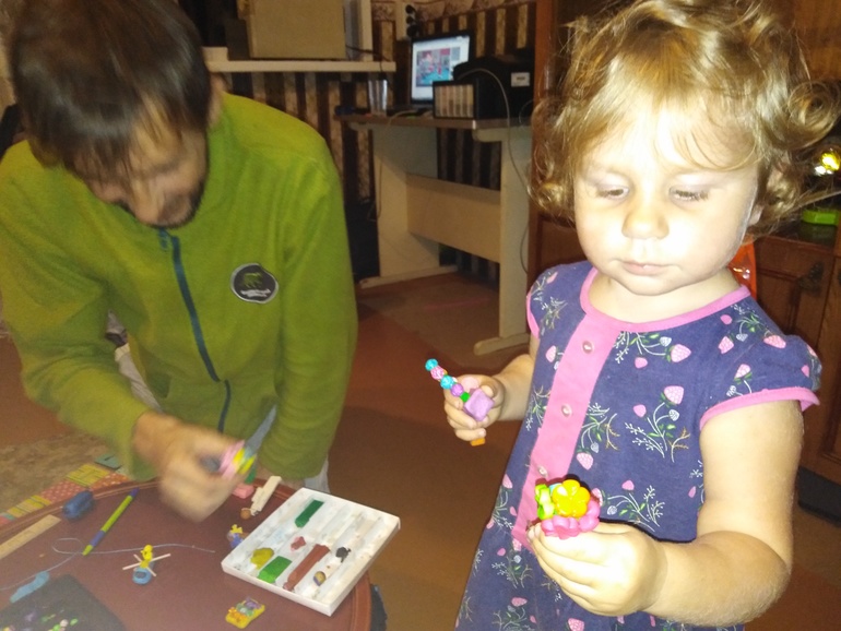 Еще моя научилась недавно нанизывать мелкие бусины на тонкую проволочку, довольная, надолго может зависнуть)))