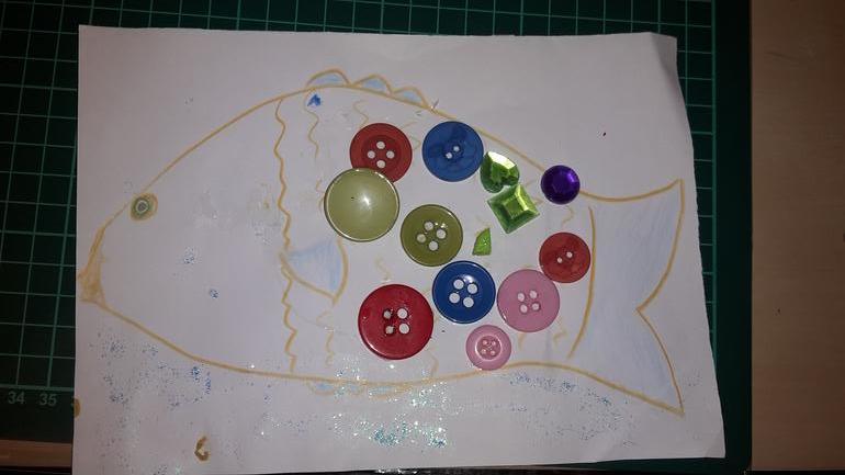 Понравилось сыну клеить пуговицы. Потом клеил их везде