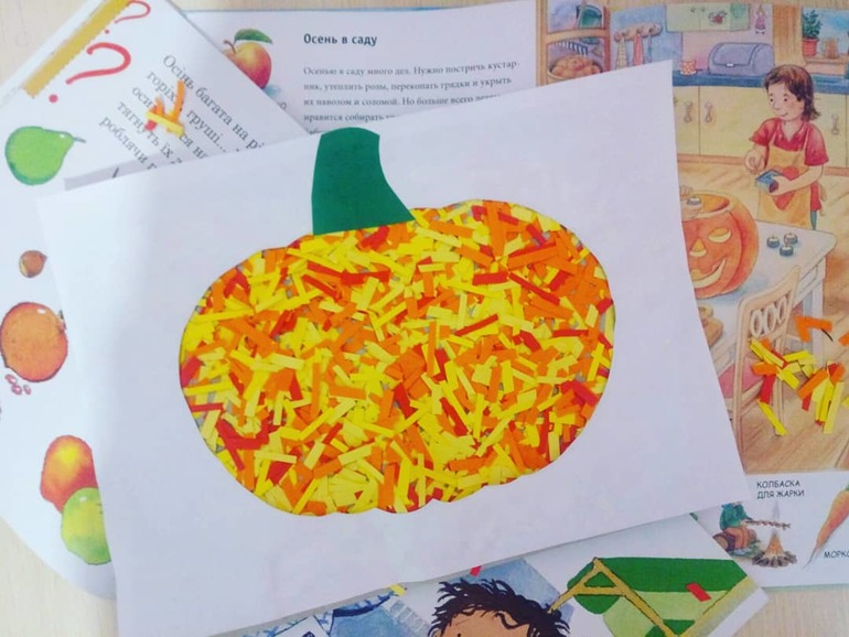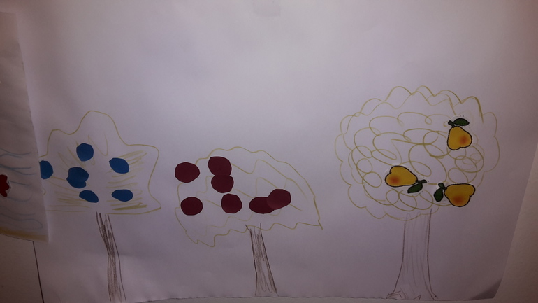 Тут и навык наклеивания, и повторили груши, яблоки и сливы, еще и сортировка по деревьям, узнали, что они на разных ростут.