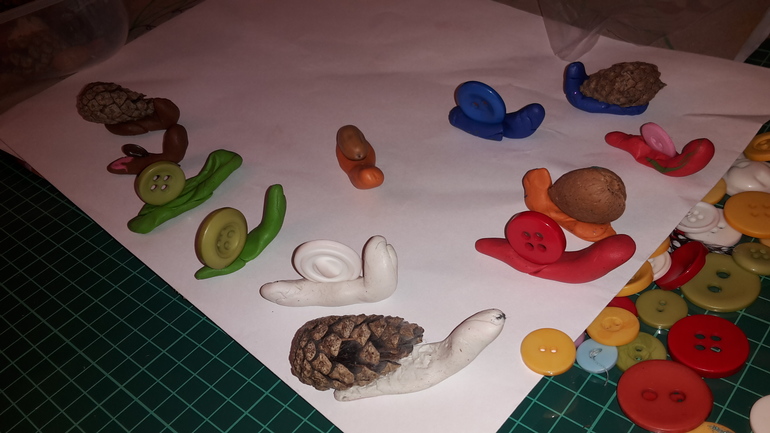 1. Улитки: первый опыт с пластелином. Взяли обычный. Жестковат. Лучше мягкий, типа плей-до. В качестве домиков были шишки, каштаны, камни, желуди. А сын придумал- пуговицы. Еще и по цвету потом подбирал. А под конец - и по размеру: маленькой улитке - маленькую пуговицу