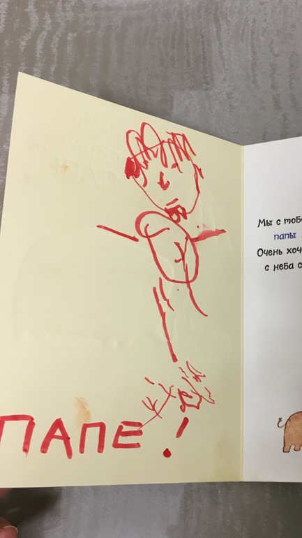 Дочка (2.11) сегодня ответственно рисовала папу на открытке. Причем, полностью отстранила меня от процесса с воплями «Я самаааа!!!». Ничего так получился, почти похоже🤣 Даже бороду не забыла (загогулины под ртом). «Папе!», конечно, вместе писали.