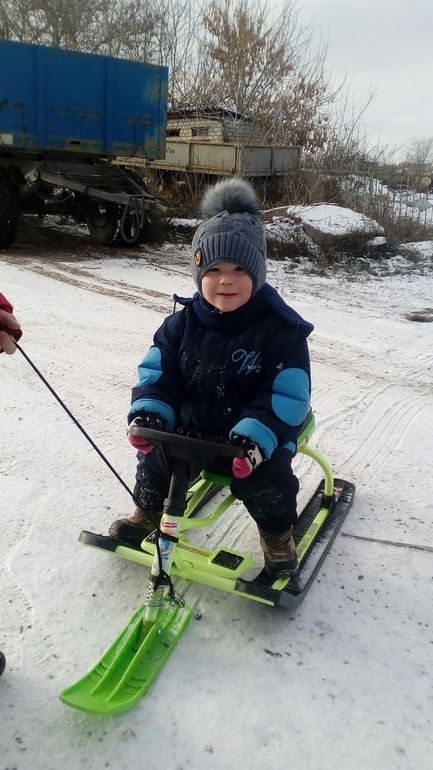 Пытались кататься с ним на коньках, в целом он стоит на них нормально и даже пытается ехать, но желания особого нет. Да мы и с дочкой в этом году на каток почти не ходили(