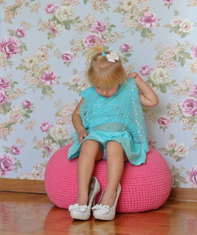 Одевается-раздевается целиком сама, включая краги, колготки и всё прочее. Не может кнопки пока застегнуть и вставить собачку молнии в замочек. Расстегивает кнопки даже на спине. Умеет определить зад-перед у одежды и перевернуть, например, футболку, не снимая с тела. Выворачивать тоже умеет одежду. Без напоминания сама меняет себе трусы, относит грязное бельё в бельевую корзину. Переодеваться очень любит, и у нас уговор: хочешь переодеться, снятое убери - чистое в ящик, грязное в стирку. Так и делает.