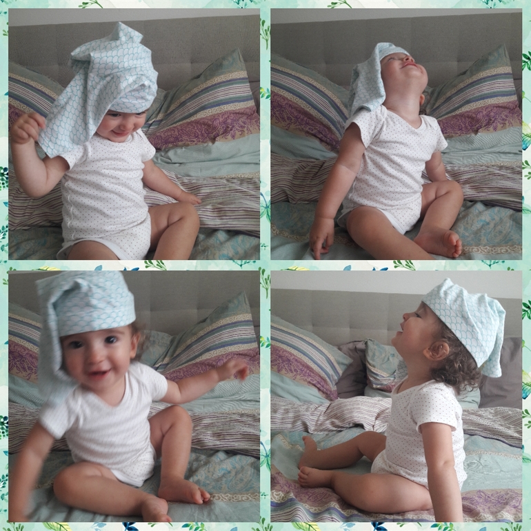 Естественно, в конце дня я забираю домой настоящую хрюшку, это просто умора. Бывает, подхожу к садику, дети резвятся на улице, моя смотрит на меня из песочницы и спокойной берёт горсть песка в рот 🙊 или голову себе посыпает 🙉😂 Тут вот снуд свой "ночным колпаком" натянула и не хотела снимать 🧙🏼♀️