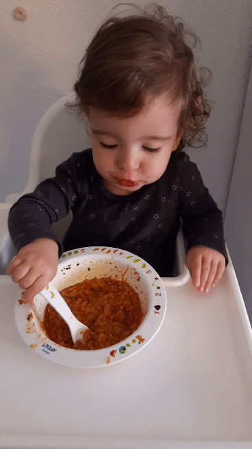 Ест хорошо и всё. В 1.2 накалывала вилкой кусочки банана и клубники. В 1.4 сама ложкой ела пюре, довольно сносно. Пьёт из чашки давно сама.