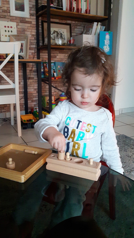 В 1.7 выдала ей пять гирек по Монтессори, она за две минуты сама их расставила по местам. Но когда 10 гирек, и их надо расставить по двум подставкам, почему-то не любит.