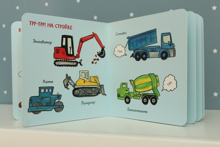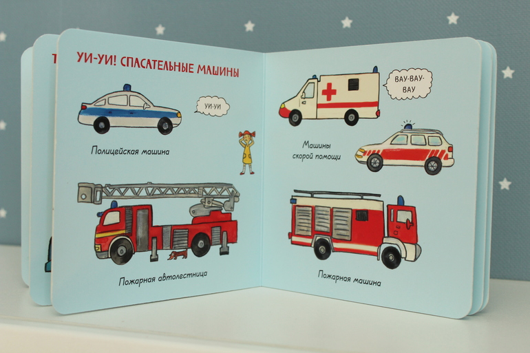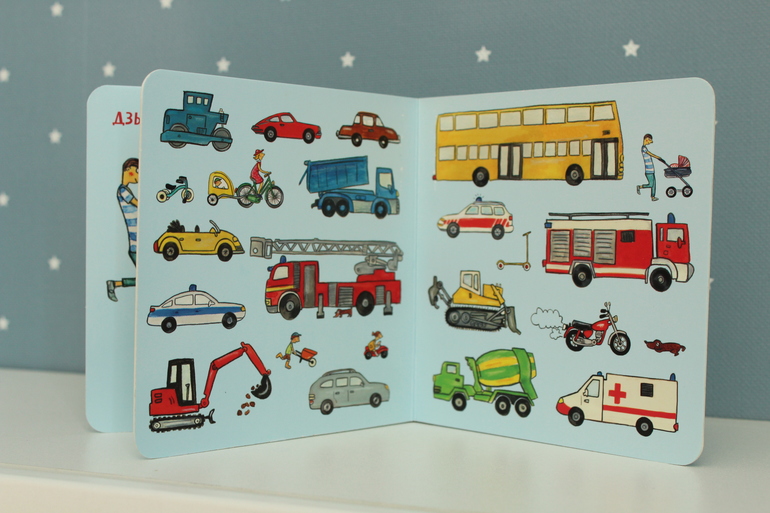Книжка-картонка. Размер всего с мою ладошку, не считая маникюра. 5 разворотов. А на всех страницах - мини-рисунки различных машин с подписями-названиями и звучаниями.