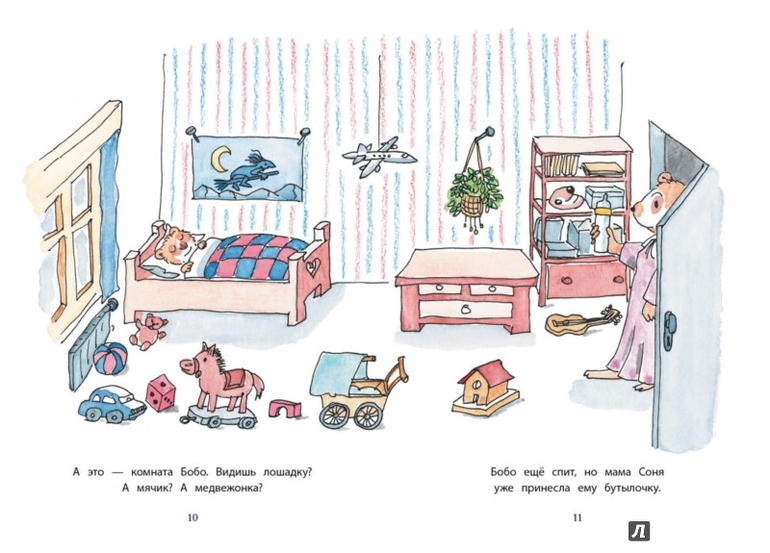 Растем и развиваемсяДевочки, поделитесь находками книг, где не просто мячик нарисован, овощ или фрукт какой и подписано, такого у нас много, а сюжентные книжки из современной литературы, кот понравились деткам. Поделюсь и я, нам понравилась книга про Бобо, это животное соня, кот. ходит с мамой гулять, в магазин, отмечает др, ложится спать и тд. привычные действия с картинками и одним предложением ниже. Под катом иллюстрация. А что понравилось вам?