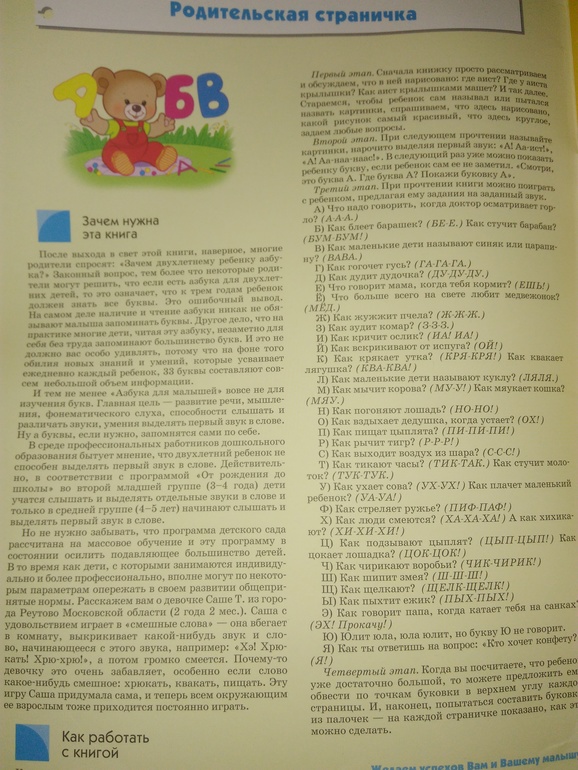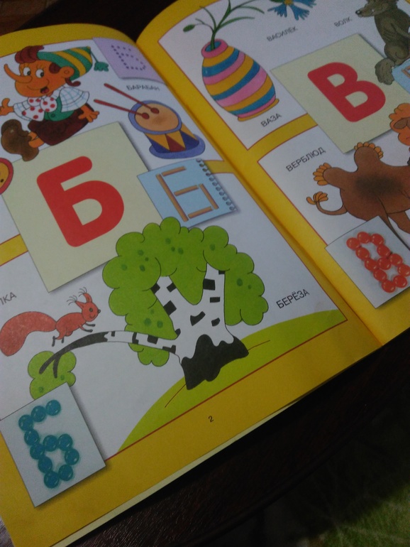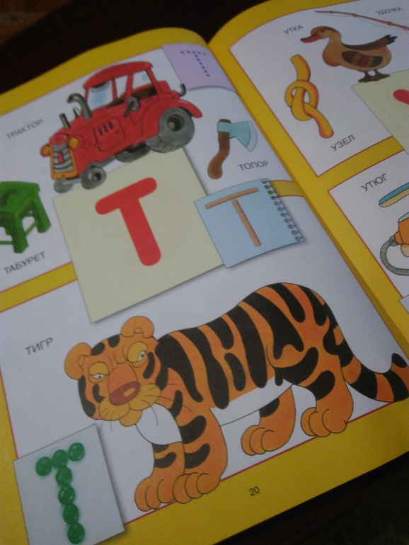 Мы не так много занимались раньше по книжкам, а в этой серии очень понравилось то, что на первой странице даже даётся подсказка : как можно заниматься, в трёх этапах. А потом очень много разноцветных крупных разных картинок на определенные буквы и предметы часто встречающиеся в обычной жизни, например, Герман сам узнал многие предметы и даже назвал на почти понятном языке) такие как трактор, автобус, самолёт, бабочка, птички...