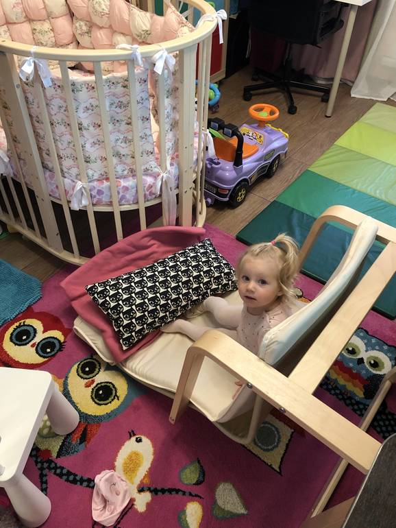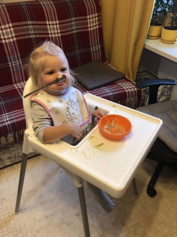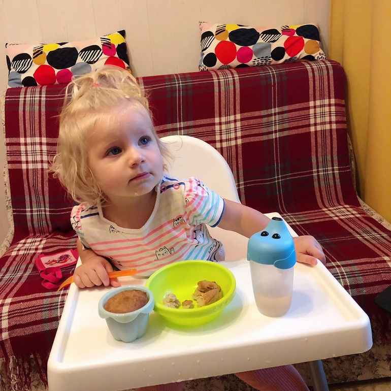 Кушает все сама, поэтому стул заменили на икеевский, чтоб мыть легче было)