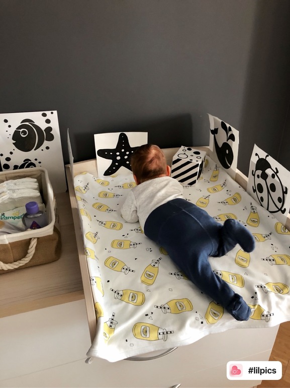 ⠀ Ник с интересом рассматривает такие картинки , пока лежит на пеленальном столе. 👀👦 Он даже пытается разговаривать с ними😂 ⠀