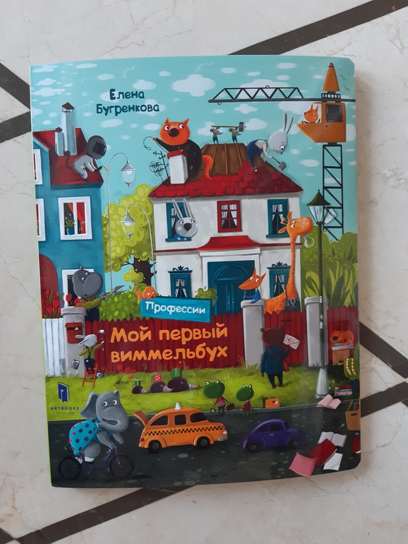 "Мой первый виммельбух, профессии", одна книжка из серии. Ярко, красочно, без какого либо текста, можно фантазировать бесконечно на тему картинок.