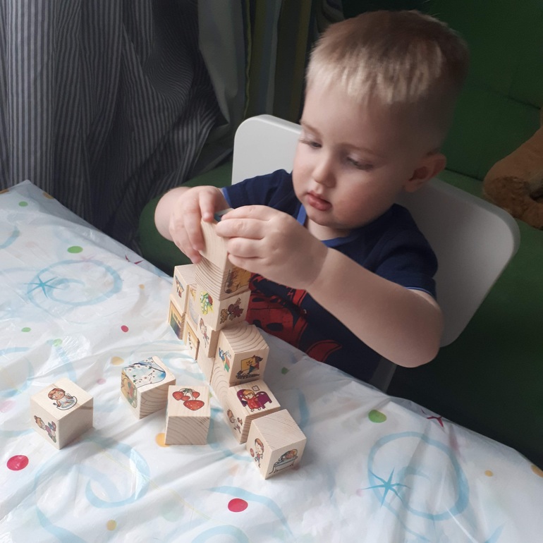 - кубики. У нас "времена года". Пока не понимает сути, строит башни и пирамиды