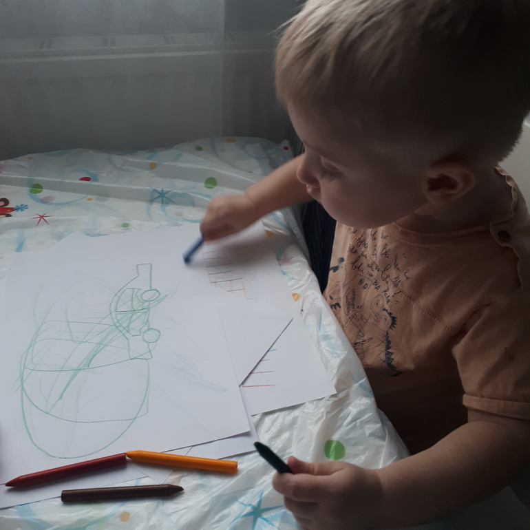 - рисиуем, раскрашиваем обычными или восковыми карандашами. Учу держать карандаш правильно, закрашивать внутри контура. Держит более менее, а дальше - каля-маля кругами. Фломастеры и прочее не даю - любит их ногтями колупать;