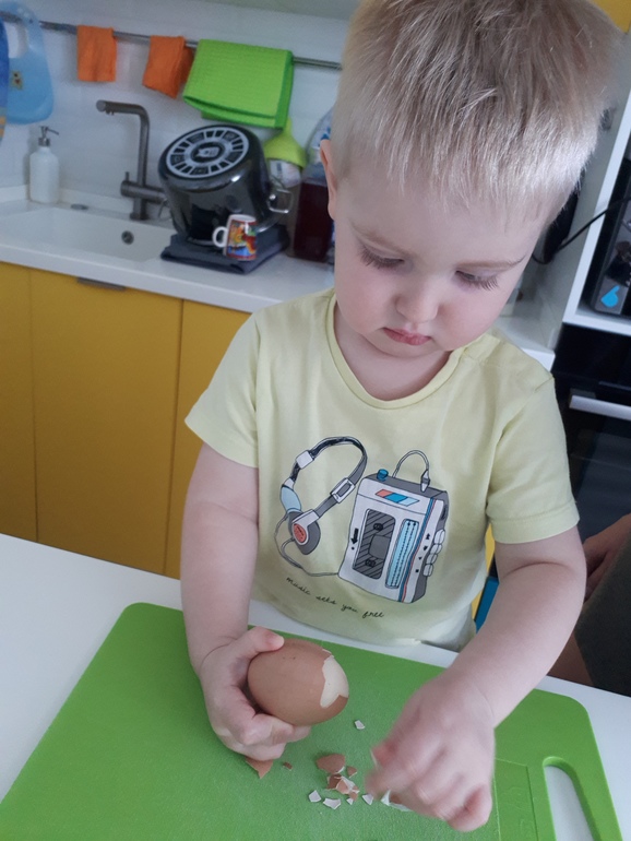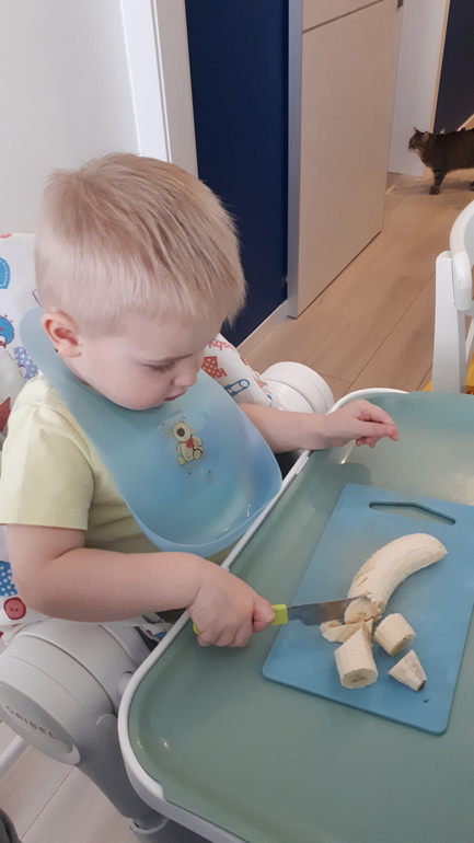 - готовим. Учу резать ножом (пока сама готовлю), тренируется исключительно на бананах
