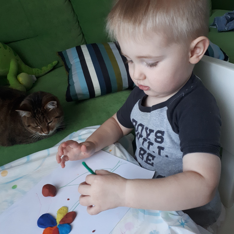 - лепим из пластелина, обычного. Научился отщипывать и колбаски катать, приминать. Шарики пока не получаются. Купила простой набор формочек, пока не доставала;
