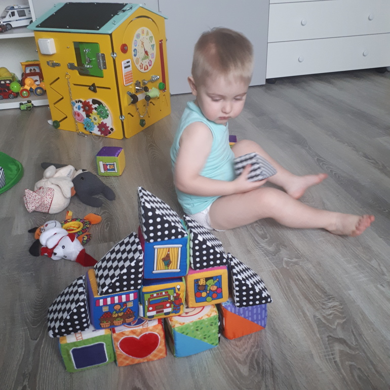 - мягкие кубики. Только недавно строить полюбил. А потом постройки вместе весело крушим