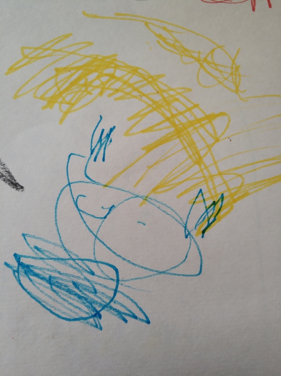 Рисует по мне так супер, проявляя бурную фантазию. На днях видео наснимала. Обезьянка с рюкзачком тянется лапками к бананам. У кошки ротик "такой большой", глазки "один большой, другой поменьше", ушки, шерсть, она абрикос держит, "тут рюкзачок такой зарисованный". Карандаши, фломастеры и восковые мелки держит неправильно, закрашивает все белые области, старается, но за контуры заходит. Закрашивает красками и кисточкой раскраски очень аккуратно, но тоже заходит за контуры, если они тонкие.