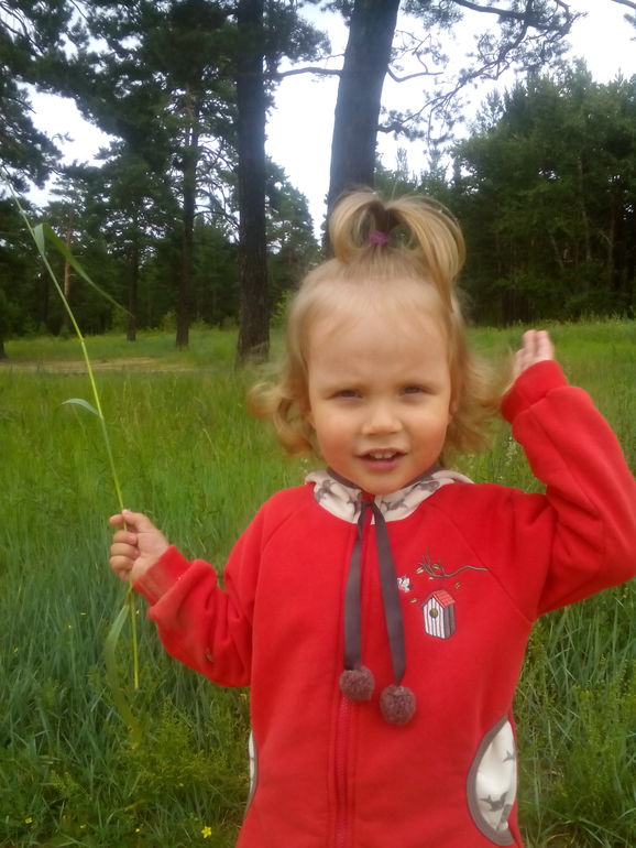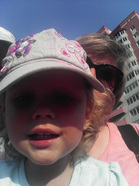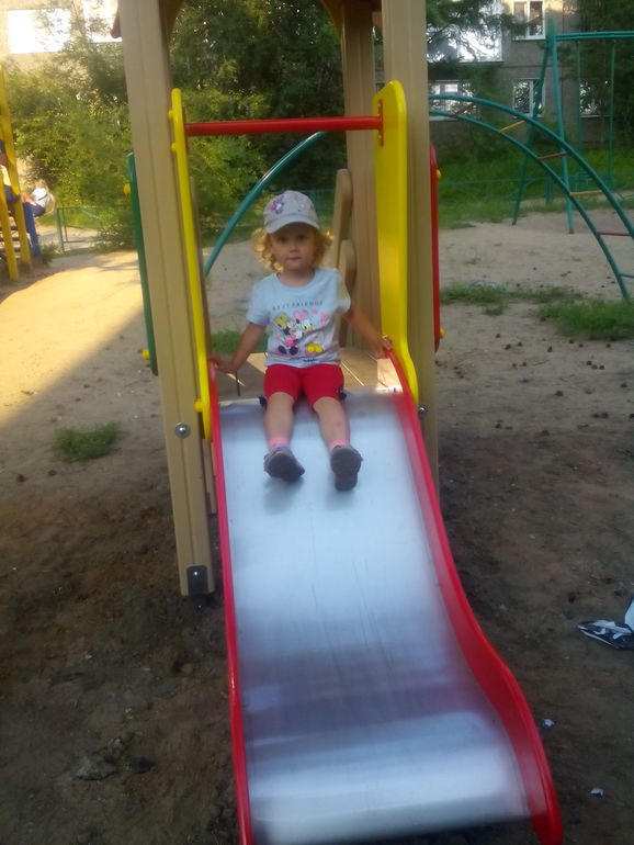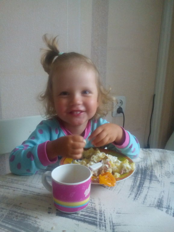Утром встаёт в 7:30-8:00, кушает(чаще сама, кашу/омлет), смотрит мультик пока я пытаюсь собраться с мыслями и кофе. Будим Марьяну, кормим, собираемся и "гагать"-целый день бы гуляла)))) часа 2 точно гуляем, причём нужно по разным площадкам ходить, везде залесть, поорать если не пускают))))