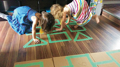 Используется малярный скотч для покраски (он легко отклеивается), очерчиваем на полу лентой девять форм. Просим ребенка или детей ставить руку или руку на разные фигуры. Игра продолжается пока ребенок не упадет. Если возраст ребенка позволяет. можно уточнять правую или левую руку, ногу.