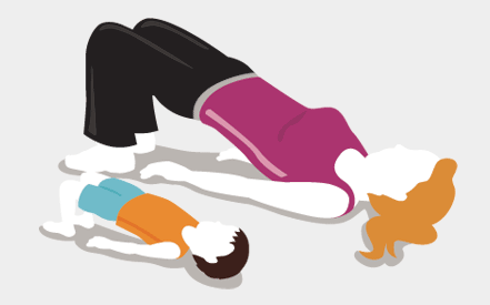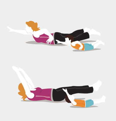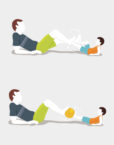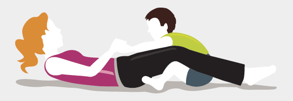 1.Положите плотно низ спины на пол. Приподнимите медленно голову и плечи, чтобы подняться в полусидячее положение. Ребенок при этом опускается на пол.