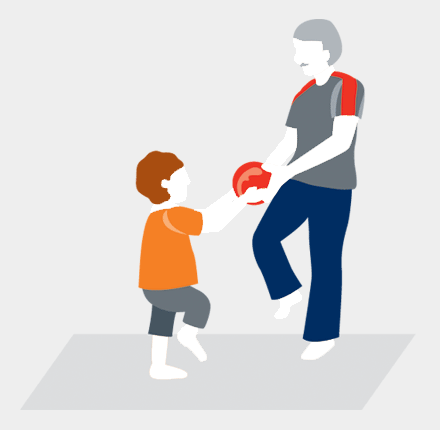 Стоя на одной ноге очень близко друг к другу, передавайте друг другу мяч из рук в руки. После пяти передач, поменяйте ногу.