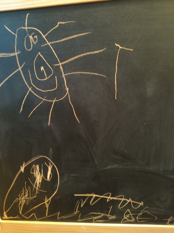Рисует часто. "Это рыба в море, прячется в водорослях, солнышко, а тут кто-то бросил вверх молоток!"