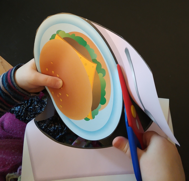 Режет сама ножницами и склеивает клеем-карандашом и ПВА, главное выдать материалы и не мешать)