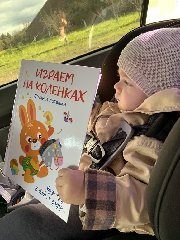Ходит с книгами гулять, листает в машине книжки-картонки, чуть просыпается и слезает с кровати - бегом к книжным полкам. Не нарадуюсь 🥰