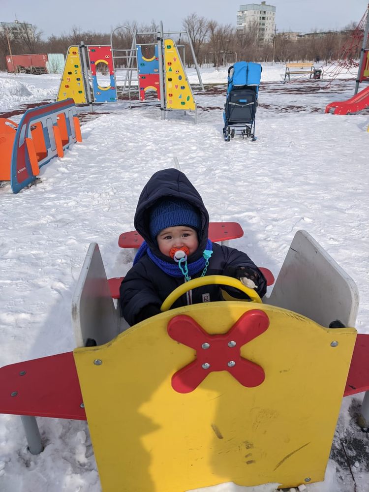 Гуляем мало и преимущественно пешком - сажаю на горку, качаю на качелях весах, если удаётся найти качели со спинкой то можем недолго в них покататься. С конца января зажигали в колясочных санках, в них он сидел лучше чем в коляске, в коляске до сих пор не любит почему-то...