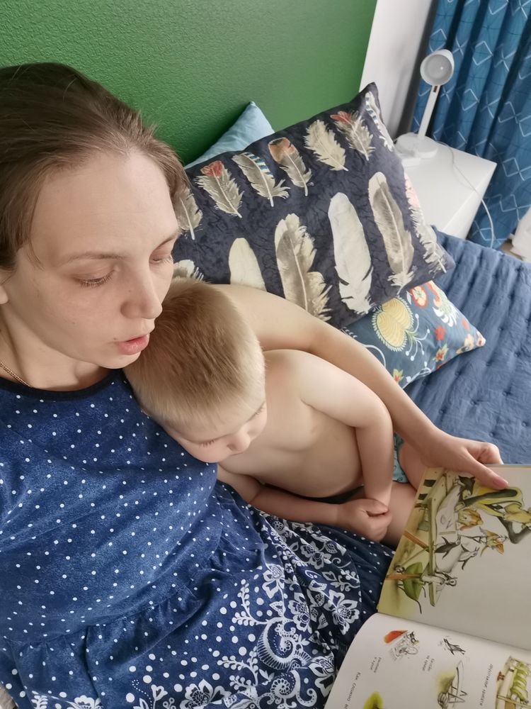 К книгам явного интереса нет у младшего. Особо не слушает, но рассматривает картинки и листает картонные странички. И грызёт. Книги Льва 🙈 Встаёт возле стеллаж и прям грызёт корешки, не доставая. Выше убирать не хочу - у старшего к ним нормального доступа не будет. Стараюсь убирать младшего и смириться, если книги пострадают. От зубов Глеба уже пострадала мебель (и его, и брата кроватки погрызены, со спорткомплекса съедена местами краска). Со Львом такого не было. Но младшего явно сильнее беспокоят зубы: и сон плохой, как у старшего, вылез зуб - и сон лучше, и чешет он глаза, уши прям постоянно, и грызёт все с большим рвением, вообще старается постоянно что-то держать во рту, погрызывая (но пустышка остаётся снотворным, после сна может немного с ней погонять и выкидывает).