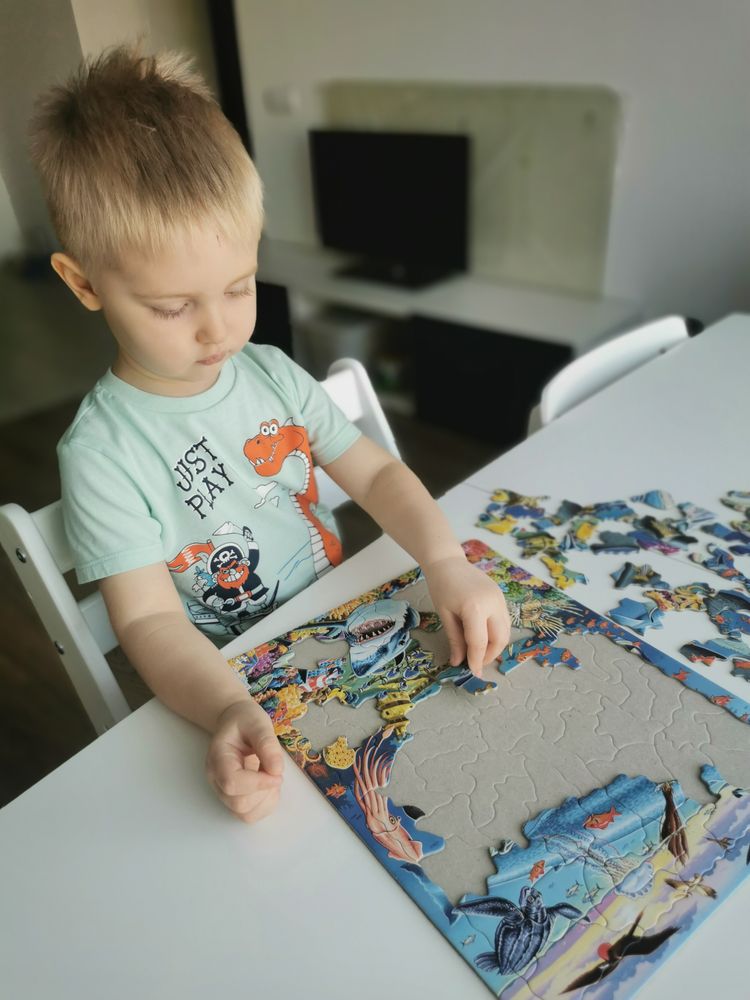 Лев развит по возросту. Он не выделяется особыми какими-то умелками: собирает пазлы (большие Джеко деталей на 60, Ларсен где-то на 70 - большего количества у нас нет), учится вырезать ножницами, раскрашивать по цветам в контуре, немножко рисует простые вещи, проходит простые лабиринты, чуть лепит, знает несколько букв и может называть слова на эти буквы, считает до 6, бегает, немного лазиет (есть осторожность, боязнь без поддержки лезть высоко), прыгает, танцует чуть, хорошо поёт и знает довольно много песен, хорошо и понятно говорит (тут даже получше большинства сверстников), любит книги (мы постоянно пополняем библиотеку, тематики разные и даже, к примеру, ни раз полностью читали "Сказку о царе Салтане" и может немного её рассказать). Придумывает сам себе игры: из подушек то дом, то самолёт, то паровоз строит, то гоняет на машине на работу, в магазин, отвозит детей в сад и тп.