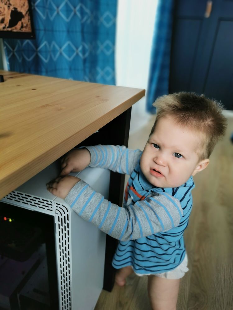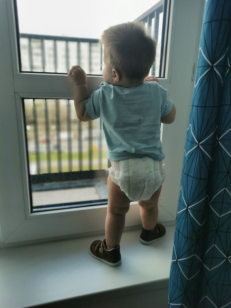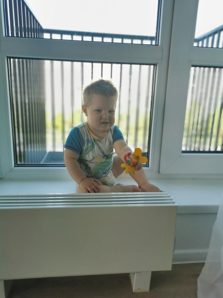 Глеб научился нажимать на кнопки. Пытается достать до дверной ручки. Любит смотреть в окно.