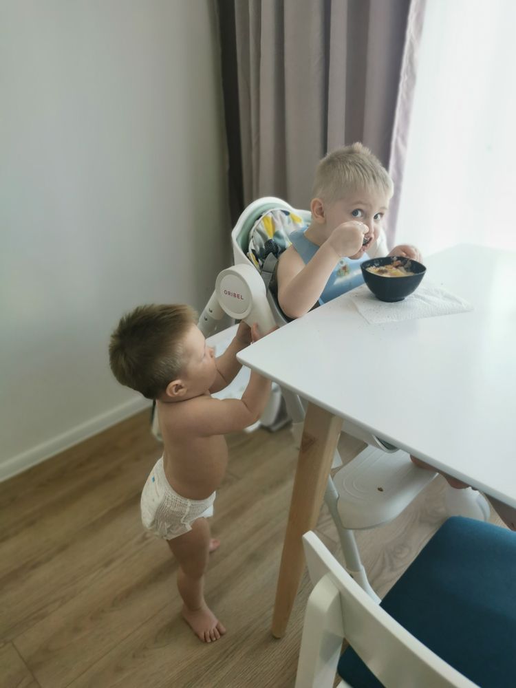 Смесь Глеб ест 1-2р в день обычно на сон. Остальное - общий стол. Стараюсь кормить их по очереди, тк Лев ленится есть самостоятельно. Но часто приходится все же ложку одному, ложку другому - видят, что брат ест и ему тоже надо за стол