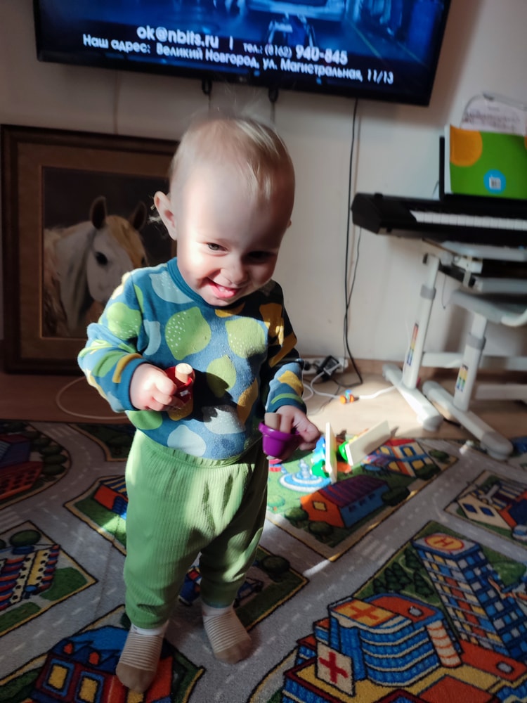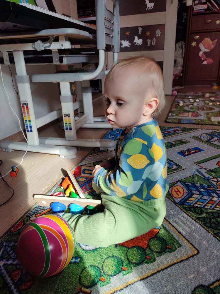 Любит кидать мячик, вращать спиннеры на липучке, играть в деревянные бусы (перебирает и крутит их на нитке), обожает сдирать и клеить обратно магниты на холодильнике... еще Алëнке нравится кидать на ламинат кольца от деревянной и пластиковой пирамидок, и смотреть, как они вращаются. Любит играть с ключами, ракушками, любит все сыпучее, шелестящее )
