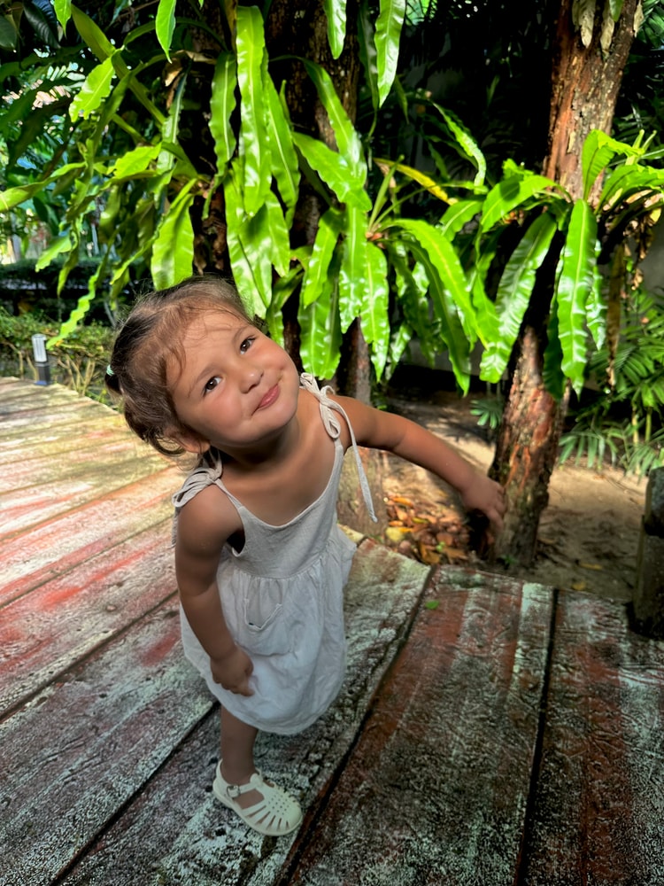 Она скачет с дивана, поёт на весь дом, как будто выступает в Олимпийском, делает вид, что укачивает куклу, а потом валит её на пол, потому что “она баловалась”. Растёт настоящим вулканом жизни. У неё ноги вечно в движении, голова — в новых идеях, а глаза — в поиске следующего приключения.
