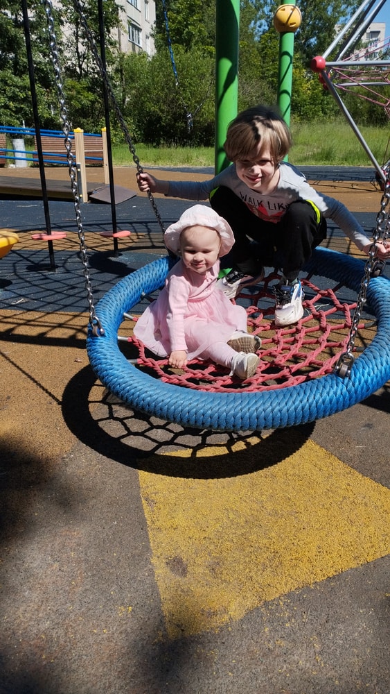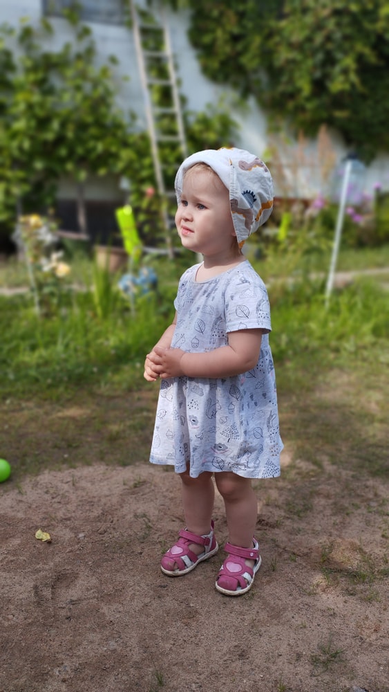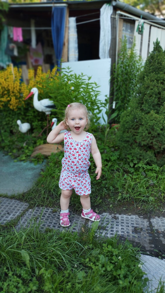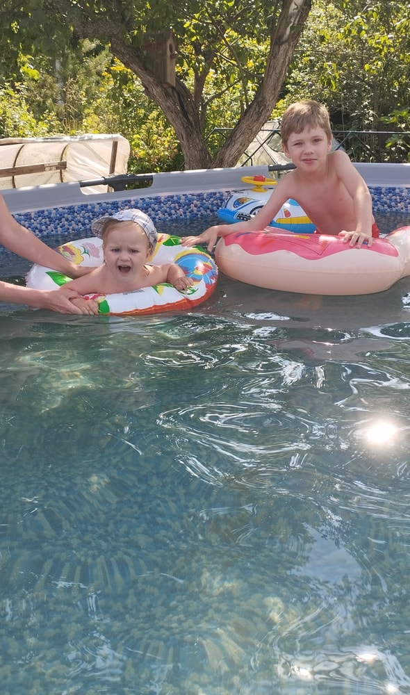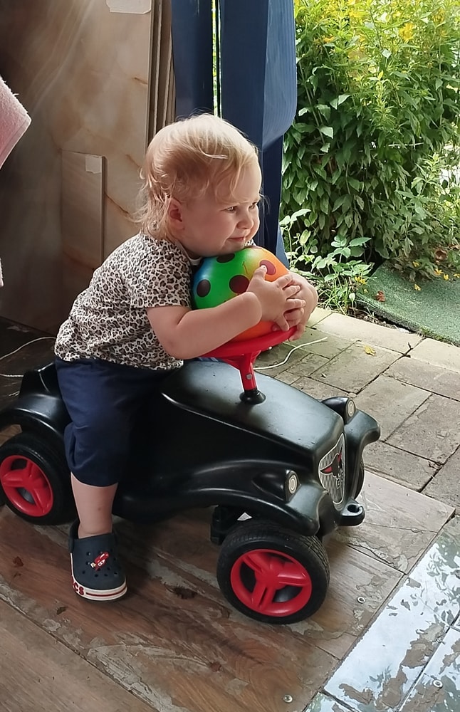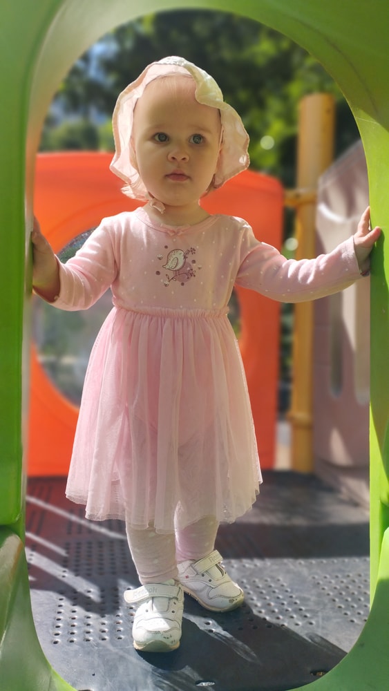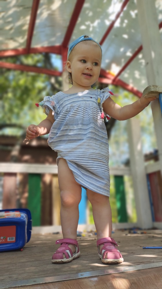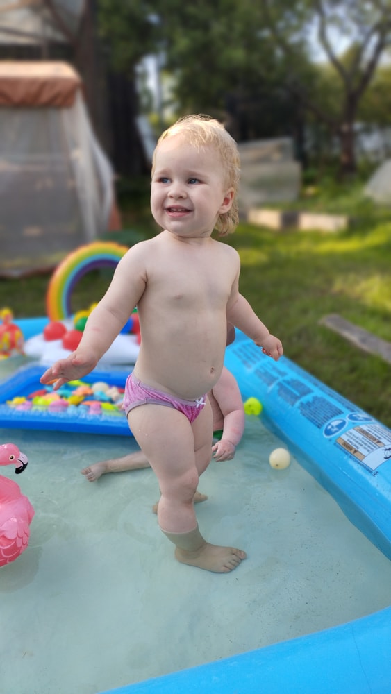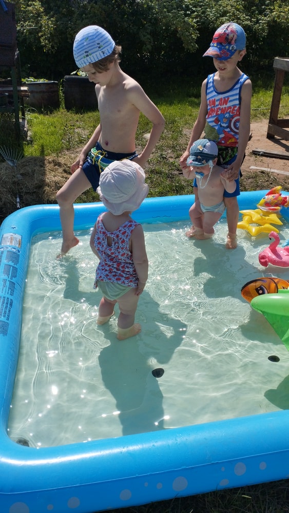 В жару ходили без памперсов, в трусиках, сложно это) она писается каждые 20 минут, это конвейер, переодеть, простирнуть и повесить. Хорошо , что в жару сохнет быстро. Собрали бассейн, старший рад, и с него не вылезает. Ви сначала испугалась , потом у соседей увидела, как купают малыша в бассейне и тоже захотела, теперь тоже на раз-два-три окунаю в большой бассейн и там ее юлозю)) Вообще стала тянутся к детям за общением. Как то контактирует с маленьким соседом ( ему 9 месяцев), смотрит на него, берет у него соску, обратно вставляет в рот, отнимает что у него в руках. К детям постарше бежит со всех ног, трогает, дает камешки. О, эти камешки. Глаз да глаз нужен. У нее вечно камни во рту. Не знаю сколько раз за прогулку я ору "плюнь" 😄 из слов, всё то же, папа , ам (кушать), па (упало) на птиц показывает пальцем и говорит " пс" и всё.) ещё говорит ай я яй, держит в ладошках нижнюю часть лица и качается в стороны (если что то уронит, упадёт). челка вечно лезет в глаза , заколки и резинки держаться на голове минуты 3, потом либо теряются, либо во рту обнаруживаю )) так что большую половину времени ходит растрепой. Нашла одежду сына, что не успели отдать, одеваю ей, так что иногда в образе пацанки бегает)