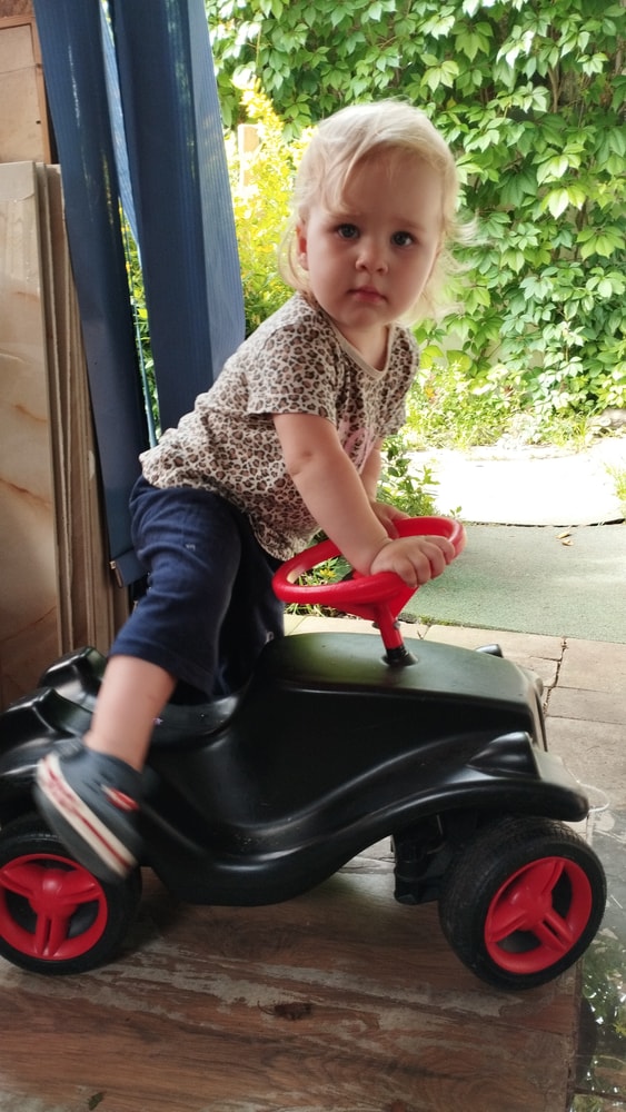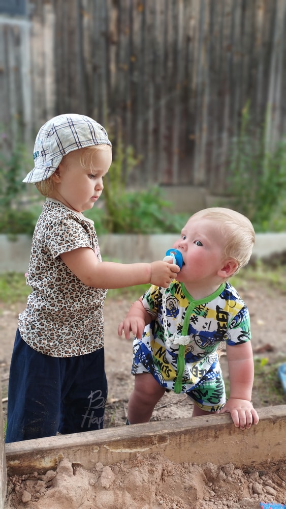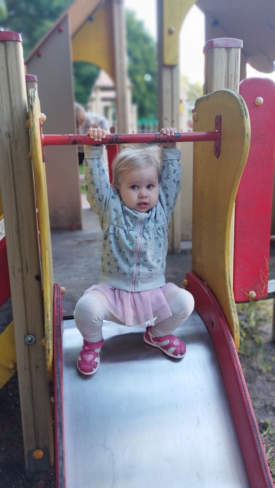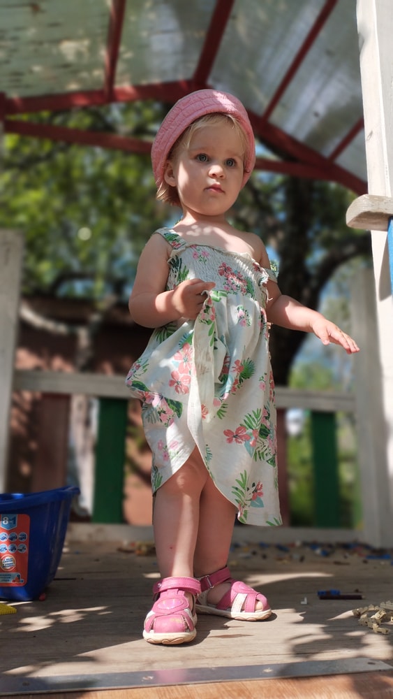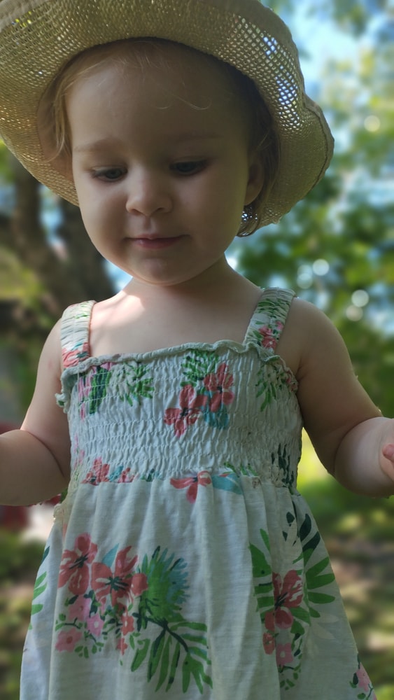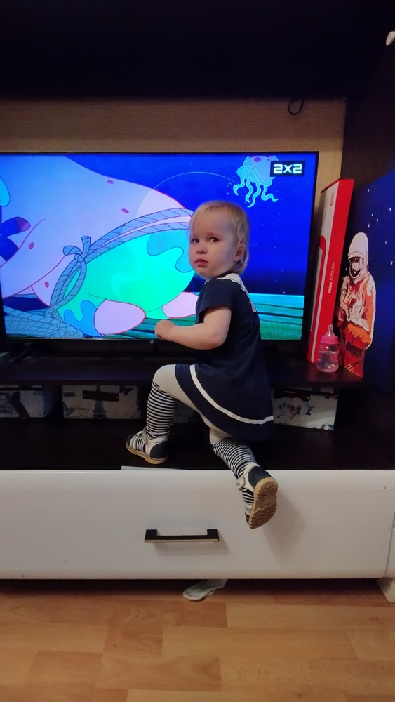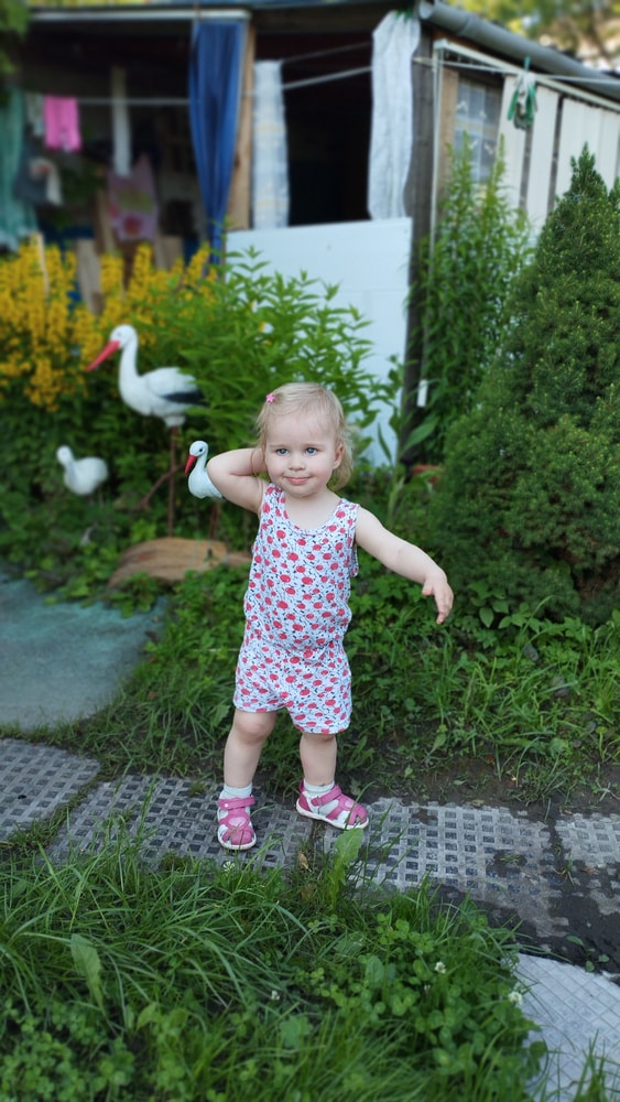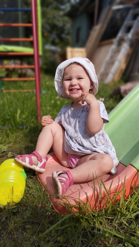 В жару ходили без памперсов, в трусиках, сложно это) она писается каждые 20 минут, это конвейер, переодеть, простирнуть и повесить. Хорошо , что в жару сохнет быстро. Собрали бассейн, старший рад, и с него не вылезает. Ви сначала испугалась , потом у соседей увидела, как купают малыша в бассейне и тоже захотела, теперь тоже на раз-два-три окунаю в большой бассейн и там ее юлозю)) Вообще стала тянутся к детям за общением. Как то контактирует с маленьким соседом ( ему 9 месяцев), смотрит на него, берет у него соску, обратно вставляет в рот, отнимает что у него в руках. К детям постарше бежит со всех ног, трогает, дает камешки. О, эти камешки. Глаз да глаз нужен. У нее вечно камни во рту. Не знаю сколько раз за прогулку я ору "плюнь" 😄 из слов, всё то же, папа , ам (кушать), па (упало) на птиц показывает пальцем и говорит " пс" и всё.) ещё говорит ай я яй, держит в ладошках нижнюю часть лица и качается в стороны (если что то уронит, упадёт). челка вечно лезет в глаза , заколки и резинки держаться на голове минуты 3, потом либо теряются, либо во рту обнаруживаю )) так что большую половину времени ходит растрепой. Нашла одежду сына, что не успели отдать, одеваю ей, так что иногда в образе пацанки бегает)