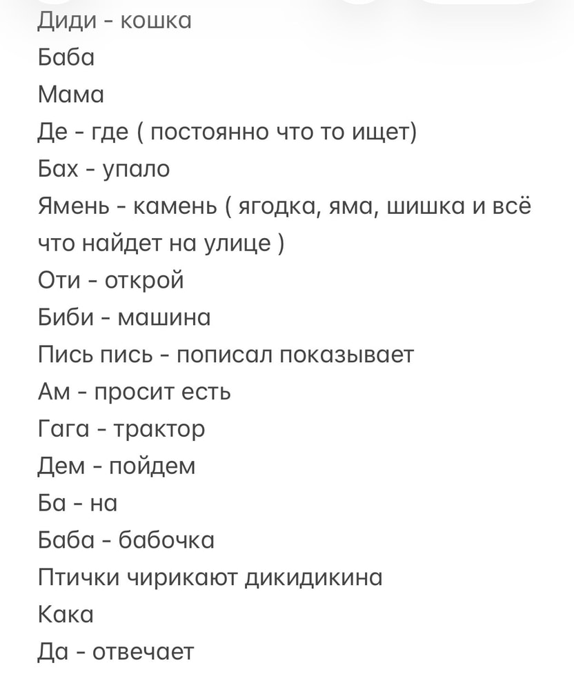 Где то наверное 45 -50 ( звукоподражаний, слов критично мало) Это еще с самыми простыми по типу водичка ссс, машинка едет брр и тд . Не называет мама,папа/тетя /дядя/баба/деда. Мы все у него баба. Все абсолютно, даже если он будет играть с детьми на площадке и кто то уйдет он кричит им баба. Наконец сказал слово мама . На вопрос от меня ему кто я ? - говорит мама. Но зовет меня если я нужна баба. Прикреплю наш словарик на память.