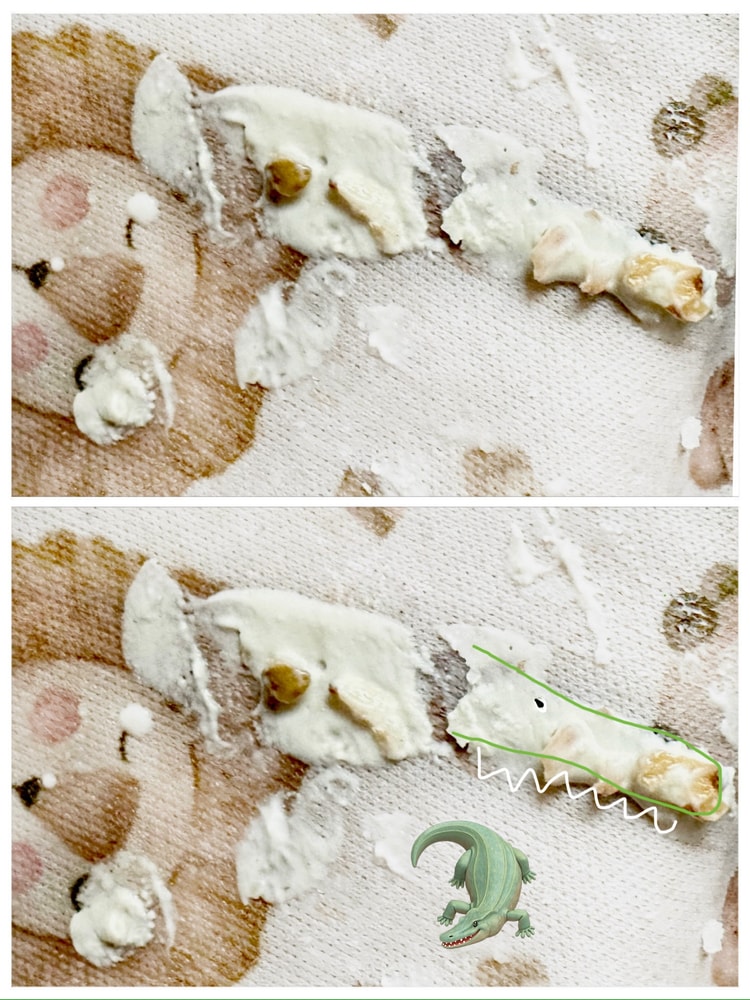 Ел йогурт с хлопьями. Показывает на пролитый йогурт: похоже на крокодила. Я сначала не могла понять. А он пальцем показывает и говорит: рот. Вот схематично изобразила😁