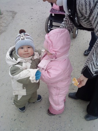 Вчера на прогулке Роме опять понравилась девочка. Делал перед ней "топ-топ-топ" - топтался быстро быстро на одном месте, подпрыгивал, и пытался обнять. То что девочку придерживала мамина рука его не устраивало, он настойчиво избавлялся от руки. Это что ревность? Чувство собственности? Обнимался так, что чуть не завалил девчушку. Тянулся лицом к ней, наверное хотел поцеловать )))