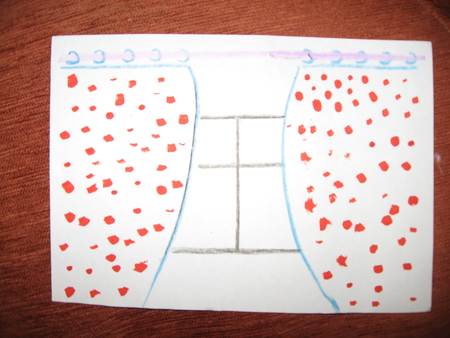 - За столом раздали нарисованные шторы, поставили краску (у нас была красная), дали кисть...нужно было для зайки разукрасить шторы....я делала Настиной рукой, ей очень понравилось ставить точки!!! вот наша работа