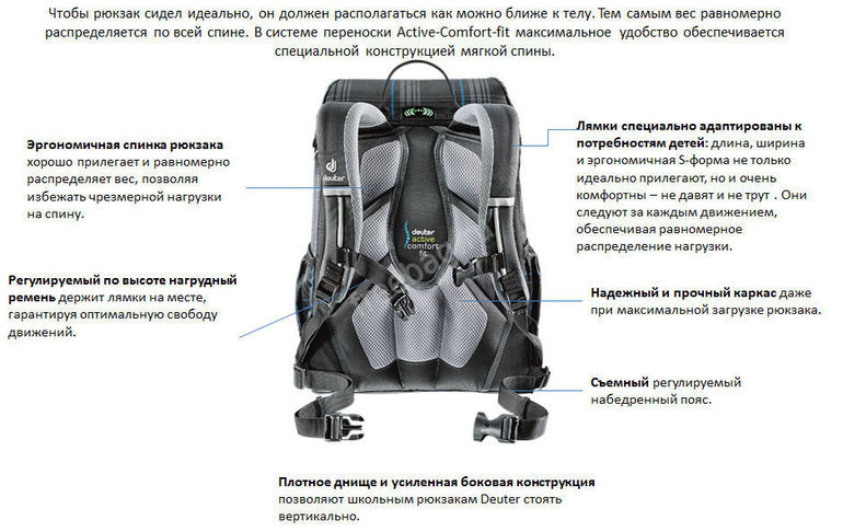 Рюкзак Deuter OneTwo разработан в сотрудничестве со специалистами Университета Рура в г. Бохум (Германия), имеющими огромный профессиональный опыт в лечение проблем позвоночника, осанки и гиподинамии у детей.