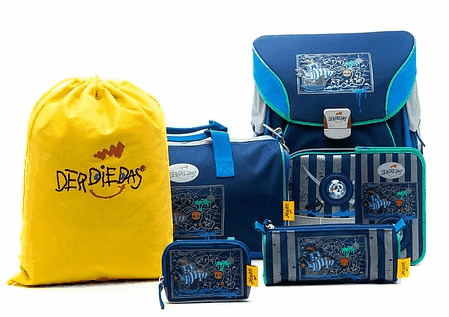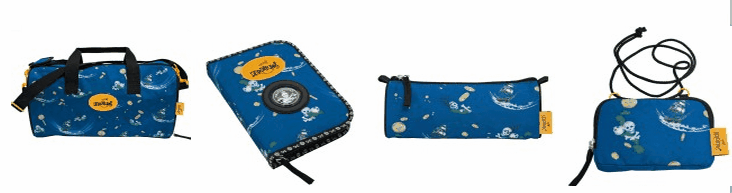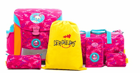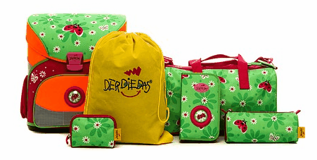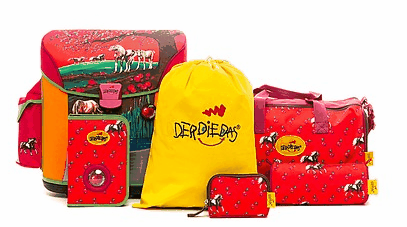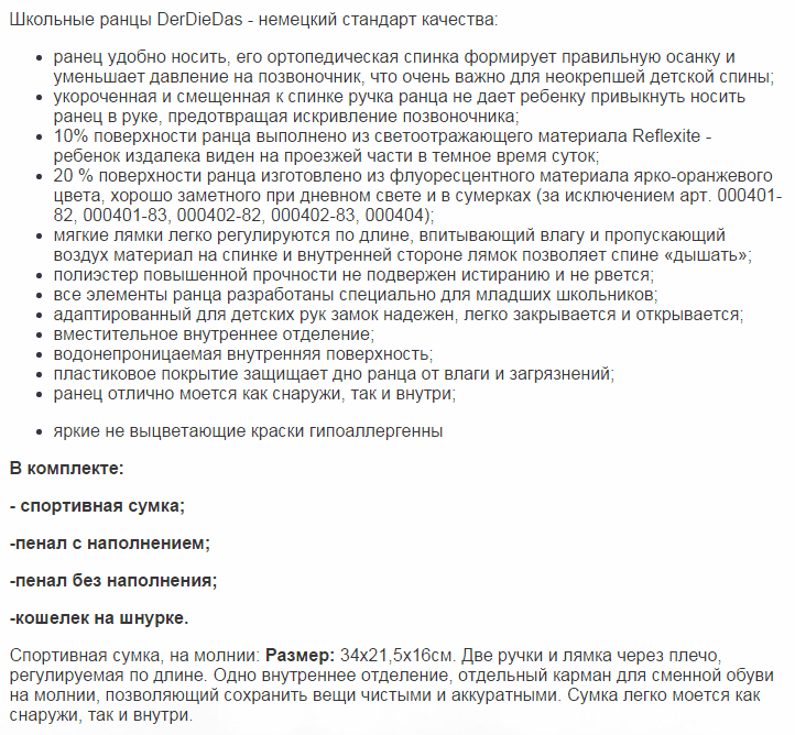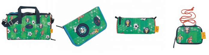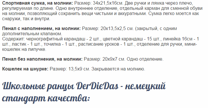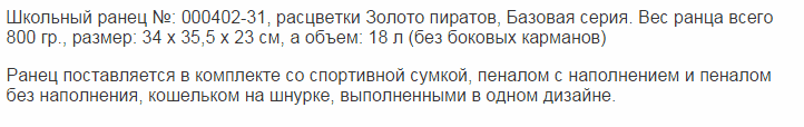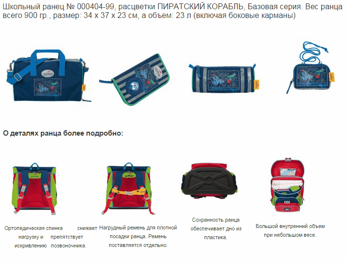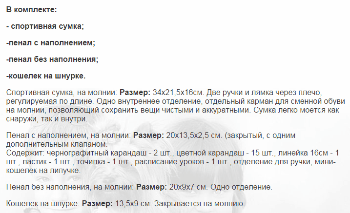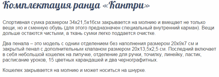 Ранец поставляется в комплекте со спортивной сумкой, пеналом с наполнением и пеналом без наполнения, кошельком на шнурке, выполненными в одном дизайне.