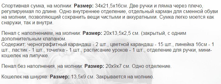 Наполнение: спортивная сумка на молнии, пенал с наполнением, пенал без наполнения, кошелек на шнурке